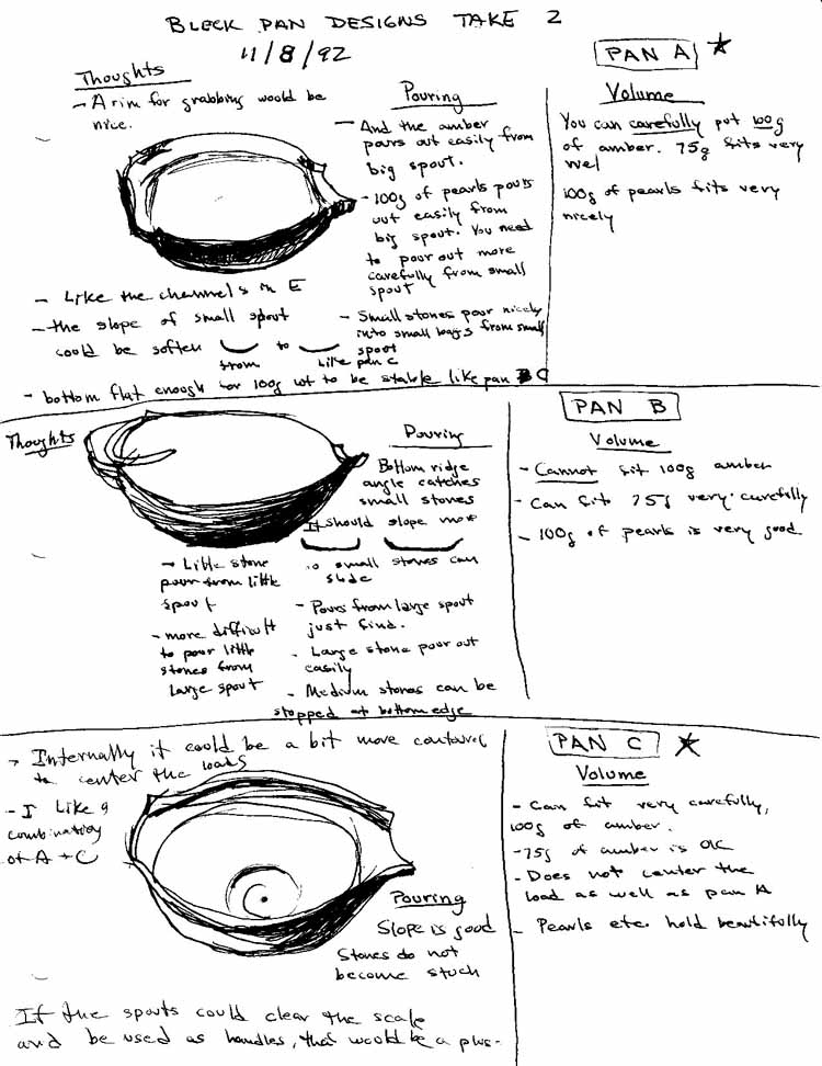 (November 1995) In the development process for the D500 weighing pan many many designs were considered and discarded. This gives a feeling for that process. In general none of the pans interact well with the cover. There is a need for a higher pan lip or thumb recesses in cover to allow a fully loaded pan to be picked up easily. The symmetrical, double spouted, pans work very nicely and are preferred by JB and I as a better idea. It’s a nice innovation to control pouring of large stones as well as small stones. And a modified internal contour is preferable when it helps center the load (as in pan E ) but allows stones to flow out smoothly (as in PAN F).