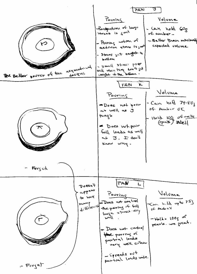 PAN A/ is a promising pan. It holds 100g of amber piled up carefully. It will hold every other material nicely and easily. It needs a weight locating area. The angle of the slope of the bowl is a bit steep as an excessive angle is required to get the last stones out at the end of a pour. Internal contouring as done in pan E and Pan F would help. Also I would like to see the slope of the smaller spout eased from this to something like this. An edge around the rim would make it much easier to pick up from the scale.
