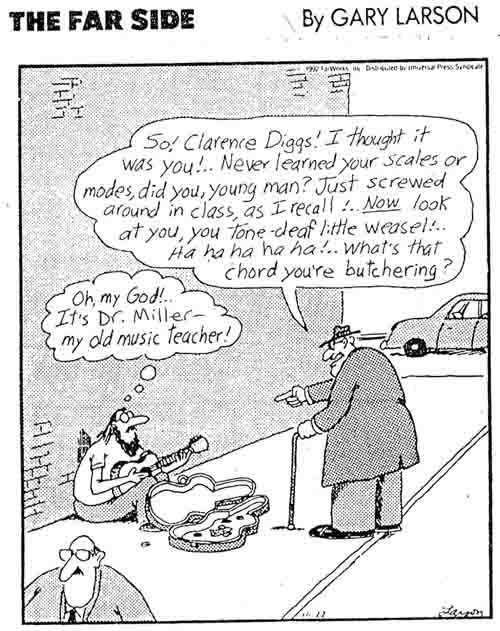Fred Miller was an exquisite classical cellist.  He played for us once (twice?) during his interment down in the basement.  But he would have been a gruesomely demanding teacher!  Someone had marked up this Gary Larson cartoon to tease him.  You must surely check out ...