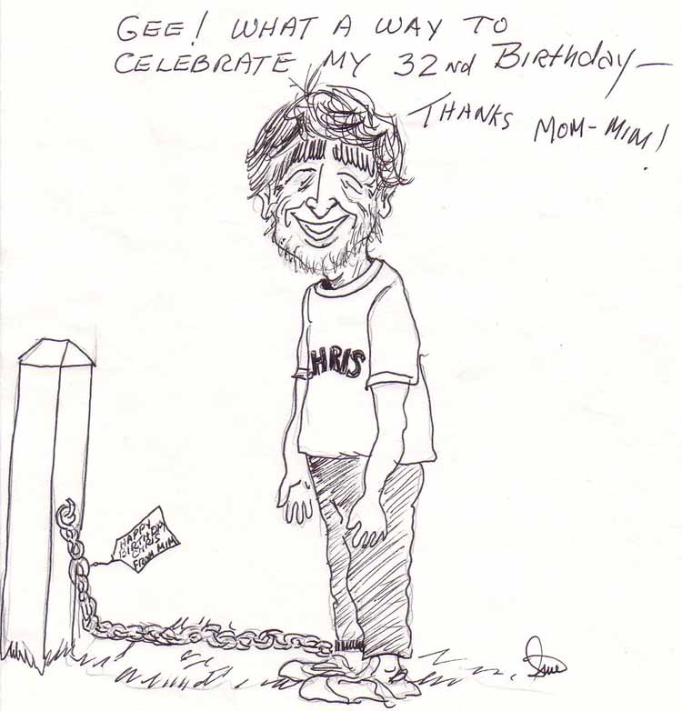 Chris was Mim's son-in-law briefly, he married her daughter Beth. The inscription reads "Happy Birthday Chris ~ From Mim" and is undoubtedly a commentary on his, uh, marital indiscretions.